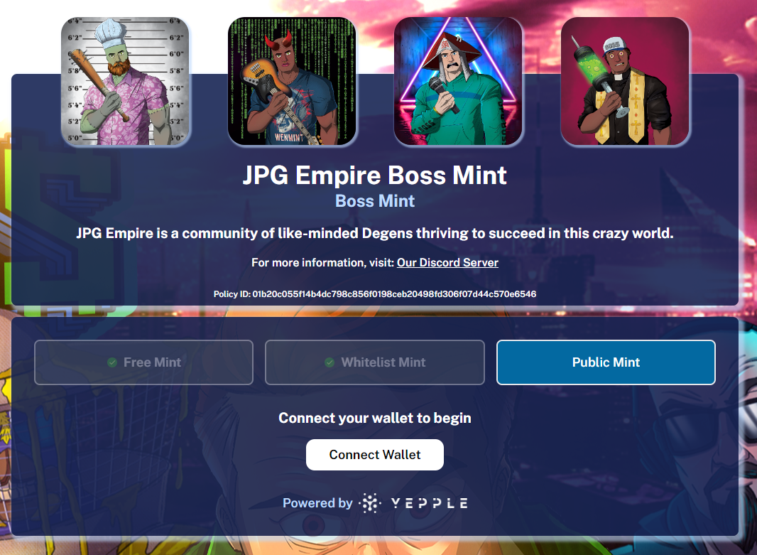 JPG BO$$ is an NFT collection on the Cardano network. The client used this collection to crowd source funding for a crypto market indicator platform. These NFTs are used to give users access to the program and interact with their discord community. The artwork had to be attractive enough to rally attention.